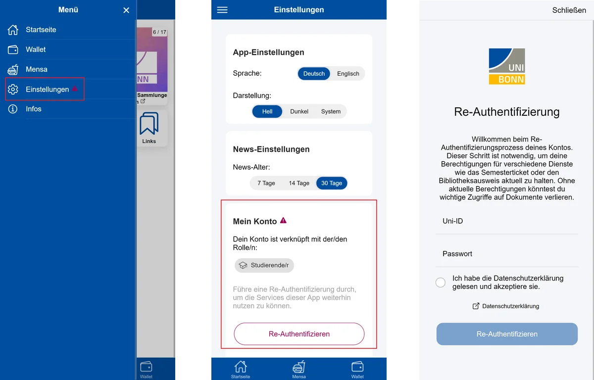 Links: Warnsymbol in dem Seitenmenü | Mitte: Aufforderung zur Re-Authentifizierung | Rechts:. Re-Authentifizierungsseite screenshots.webp image/webp Typ image/webp Dimension Abmessungen 1200x768 Size Dateigröße 51.2 KB Herunterladen Bild in voller Größe anzeigen…